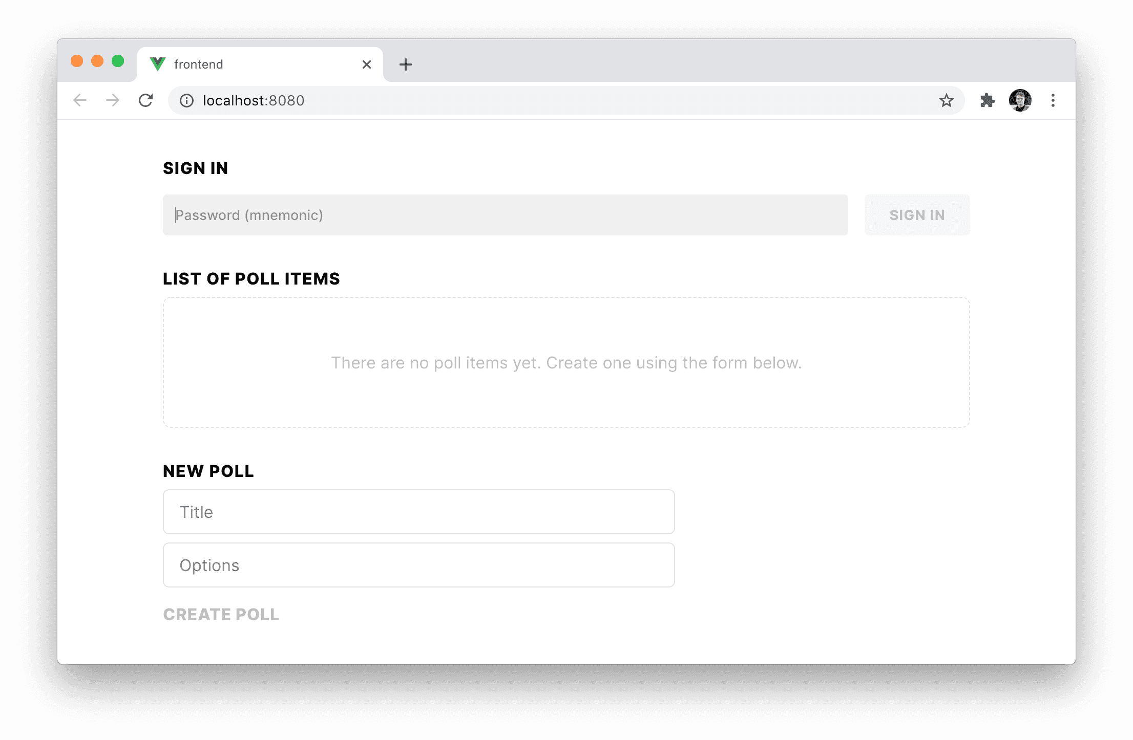 starport type poll title options이제 starport serve를 실행하고 http://localhost:8080을 방문하면 poll이 생성된 것을 볼 수 있습니다.